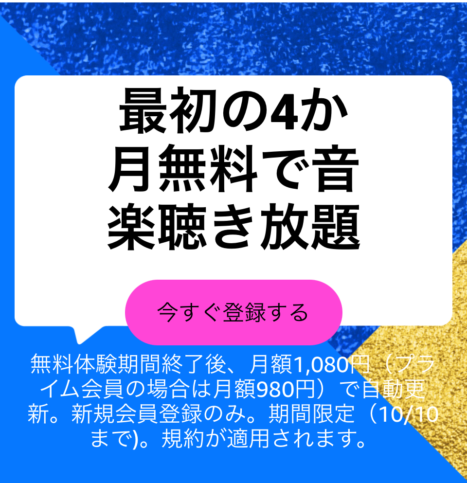 Music Unlimited(音楽聴き放題)4ヶ月無料 2025 9/26 Amazon お得情報 2025-09-26 当ページのリンクには広告が含まれています。 今は無料期間のお得なキャンペーン中!プライム会員で初めての利用者は4ヶ月無料で音楽聴き放題!(10/10まで) \ 4ヶ月無料はお得すぎる! / Music Unlimited(音楽聴き放題)4ヶ月無料 Amazon お得情報 よかったらシェアしてね! URLをコピーしました! URLをコピーしました! Kindle Unlimited(本読み放題)お得なキャンペーン Amazon Audible(本聴き放題)無料体験! 関連記事 LYPプレミアムで5,000円相当ゲット!? 2ヶ月無料登録で爆得しちゃおう! 2025-10-13 Amazon Audible(本聴き放題)無料体験! 2025-09-26 Kindle Unlimited(本読み放題)お得なキャンペーン 2025-07-07 Amazonプライム会員を無料体験! 2025-05-13 エントリーリスト!楽天お買い物マラソンでポイント取りこぼしゼロ 2025-02-04 旦那ストレス解消⁉ 年末年始の救世主はこれでした! 2024-12-30 【楽天】福袋2025の発売はいつから?福袋の中身ネタバレまとめ! 2024-10-14 Prime Video 初回30日無料体験キャンペーン 2024-07-11 コメント コメントする コメントをキャンセルコメント ※ 名前 ※ メール ※ サイト 次回のコメントで使用するためブラウザーに自分の名前、メールアドレス、サイトを保存する。
